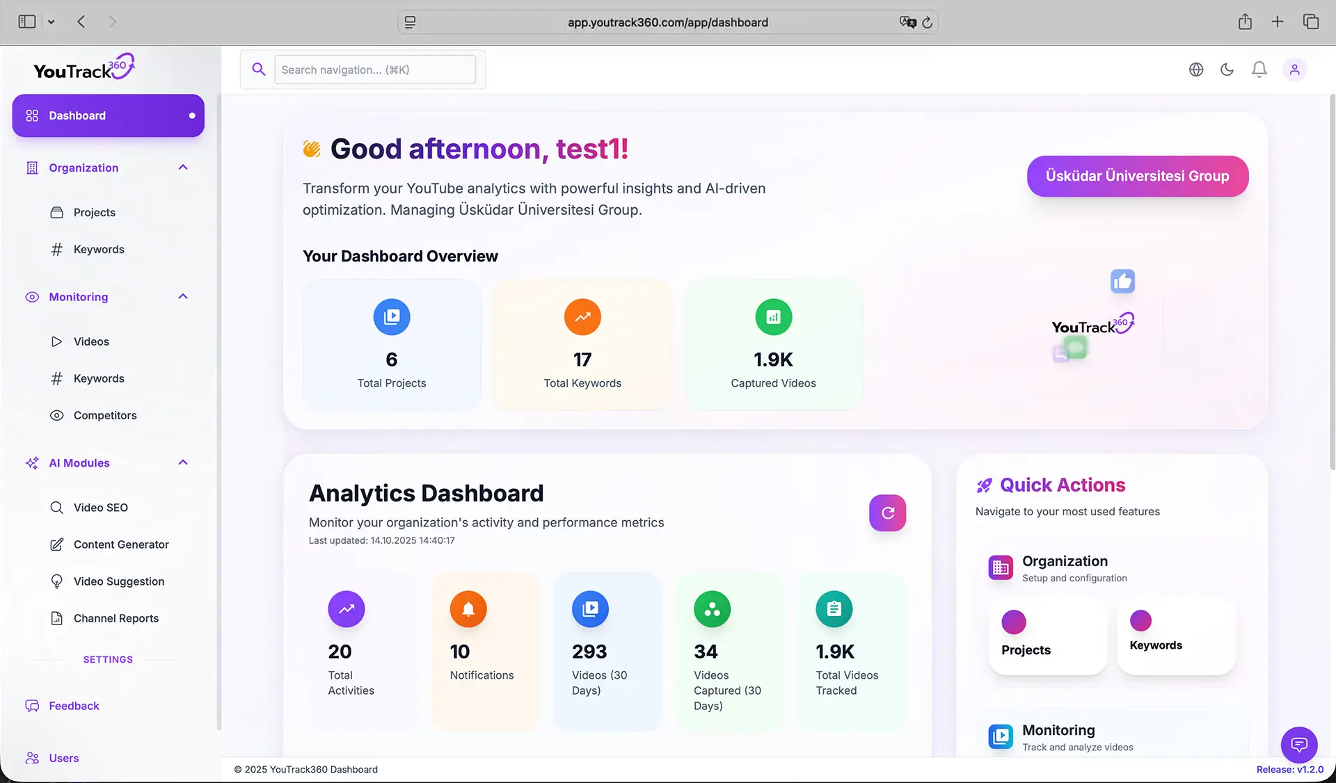YouTrack360, içerik planlama, analiz ve optimizasyon süreçlerinizi hızlandırarak zaman kazandırır. Veri odaklı içerikler oluşturmanızı ve sürekli büyümenizi sağlar.